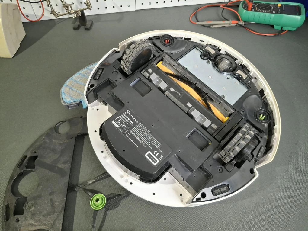 Диагностика началась с подключения к сервисному ПО. Мастер считал код ошибки — неисправность привода правого колеса. Внешний осмотр показал нормальное состояние шины колеса. При прокручивании вручную ощущалось заедание и люфт. Это указывало на механическое повреждение мотор-редуктора. Для точной диагностики потребовалась частичная разборка корпуса робота N8 PRO EU DLN11.