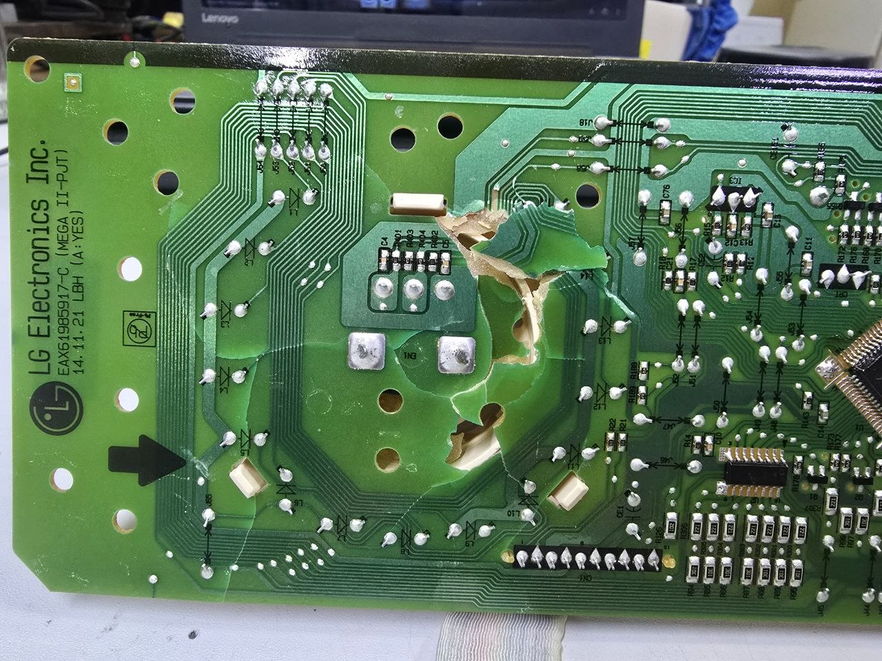 Проблема полного отказа включения модели F10B8MD часто связана с внутренними повреждениями основной платы управления. Энкодер селектора напрямую соединен с основным модулем через шлейфы. При сильном механическом воздействии на ручку переключателя вибрация передается на текстолит платы. В модели LG F10B8MD это приводит к микротрещинам в токопроводящих дорожках. Контакт пропадает, питание не поступает на процессор управления. Машина не запускается, хотя индикаторы могут частично гореть. Самостоятельная диагностика здесь опасна из-за высокого напряжения внутри корпуса устройства.
